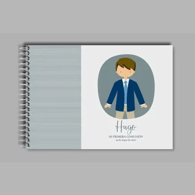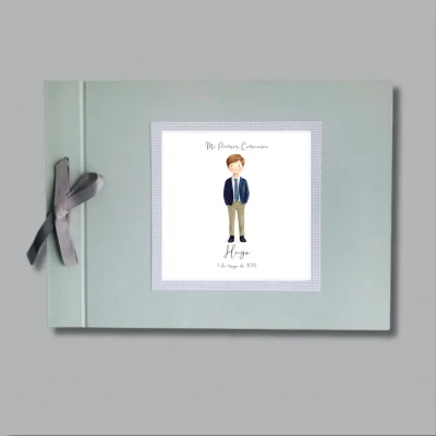 La portada está forrada en papel de alta calidad y se personaliza con el nombre del niño y la fecha de la comunión, combinados con una ilustración en acuarela que define el estilo del diseño.
