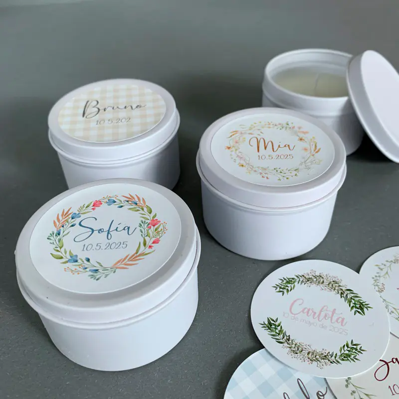 Personaliza este detalle añadiendo una de nuestras etiquetas en la tapa. Así, conviertes esta vela en un recuerdo exclusivo, ideal para bautizos, comuniones, bodas y eventos especiales.
