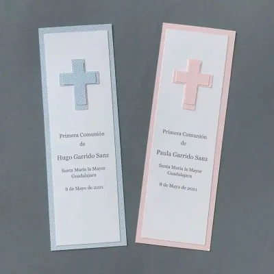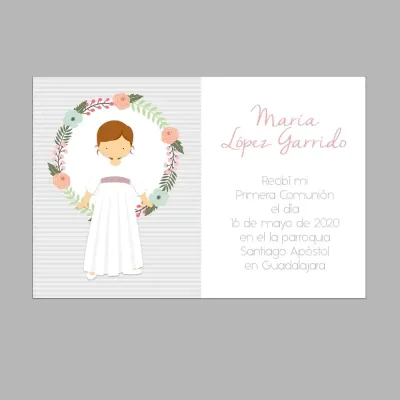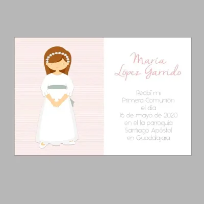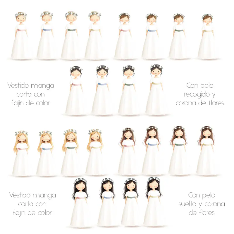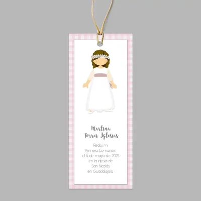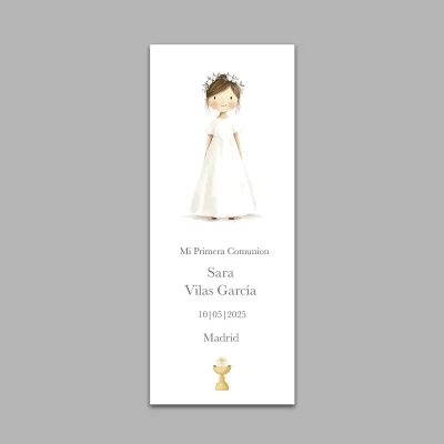 Este elegante recordatorio de comunión está diseñado para capturar un momento especial con un toque personalizado. El diseño presenta a una niña de comunión y puedes elegir color de pelo y traje entre las opciones en el muestrario, creando un detalle único.