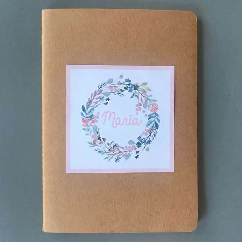 Cuaderno A5 con tapas kraft de 300 gr y 40 hojas con lineas en su interior de 80gr con portada personalizada con corona y marco a elegir.